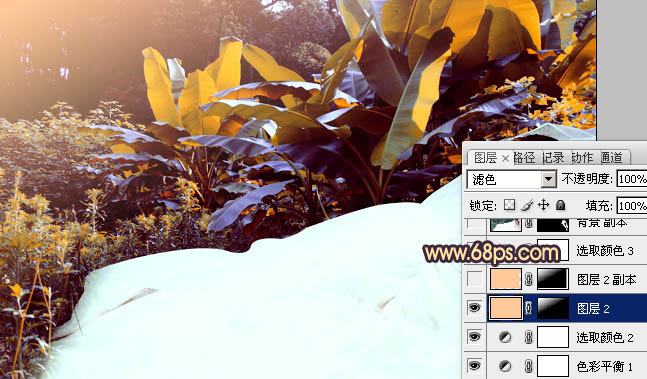 5、新建一个图层,填充橙黄色:#FFC99A,混合模式改为“滤色”,加上图层蒙版,用黑白渐变拉出下图所示的透明渐变。
