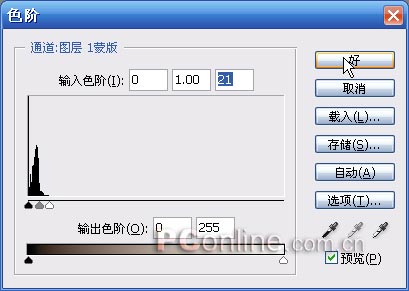 9.在色阶窗口(快捷键Ctrl+L)中,拖拽白色输入滑杆到左边第一个像素峰群边缘。点击“好”按钮。(图09)