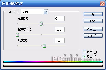 11.在图层面板中选择“图层1”。在浮动工具面板屏幕模式上方点击“以标准模式编辑”按钮,确保你在标准模式下。调整图层1的全图的色相/饱和度(快捷键Ctrl+U)。设置饱和度为-100并调整亮度。确保预览复选框被选中,并且使牙齿不要比眼睛更亮。(图12)