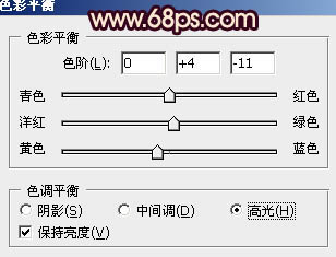 5、创建色彩平衡调整图层,对阴影,高光进行调整,参数设置如图9,10,效果如图11。这一步微调暗部及高光颜色。