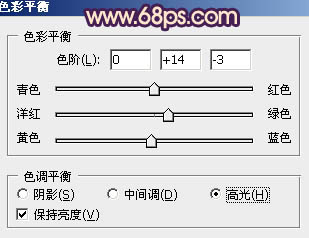 10、创建色彩平衡调整图层,对高光进行调整,参数设置如图23,确定后适当降低图层不透明度,效果如图24。