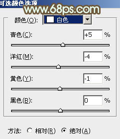 7、创建可选颜色调整图层,对白色进行调整,参数设置如图12,效果如图13。这一步调整图片高光颜色,增加人物肤色质感。