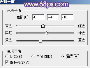 5、创建色彩平衡调整图层,对阴影、中间调、高光进行调整,参数设置如图11 - 13,效果如图14。这一步加强背景蓝色及增强人物肤色亮度。