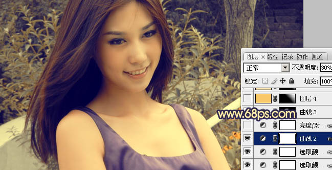10、创建曲线调整图层,对蓝色进行调整,参数设置如图19,确定后把图层不透明度改为:30%,效果如图20。