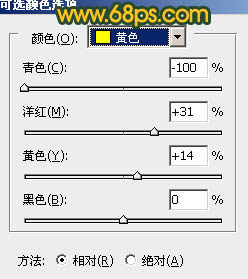 2、创建可选颜色调整图层,对黄、绿、白、中性色进行调整,参数设置如图2 - 5,效果如图6。这一步把背景绿色转为青色,黄绿色转为橙色。