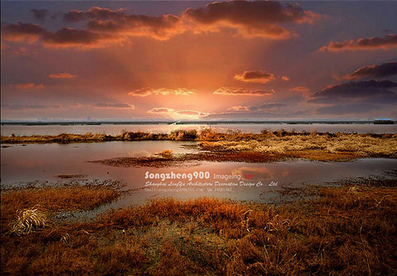 本教程以合成为主。原图素材缺少天空部分,而且颜色也偏灰。处理的时候需要先用朝霞素材叠加到天空部分,然后给水面增加倒影,再整体润色即可。