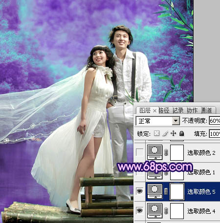 2、创建可选颜色调整图层,对青色,蓝色进行调整,参数设置如图4,5,确定后把图层不透明度改为:60%,效果如图7。这一步加强青色浓度,同时把背景部分蓝色部分转为紫色。