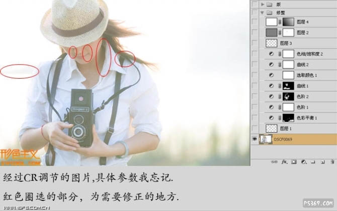 2、先用Raw插件调节图片,适当调亮一点,没有这款插件的可以直接用PS调亮,大致效果接近即可。调亮后下图红圈部分需要稍微修正。