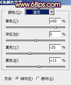 12、创建可选颜色调整图层,对蓝,黑进行调整,参数设置如图27,28,效果如图29。这一步微调暗部的蓝色。