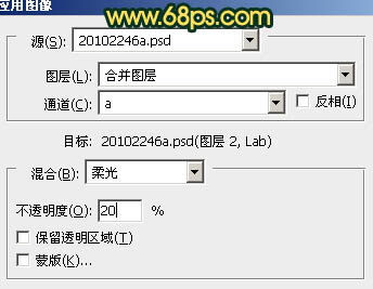 6、执行:图像 > 应用图像,参数设置如图13,效果如图14。确定后选择菜单:图像 > 模式 > RGB颜色,选择不合拼。这两步处理是增加图片的红色及暗绿色。