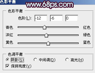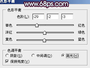3、创建色彩平衡调整图层,对阴影、中间调、高光进行调整,参数设置如图10 - 12,效果如图13。这一步增加画面的紫色和淡蓝色。