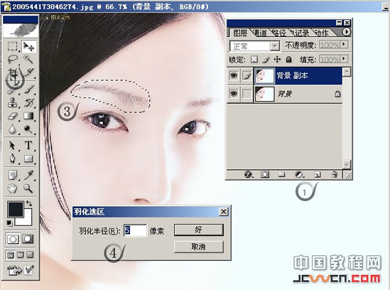 副本.从工具箱中选择套索工具,在眉毛周围画出一个松散的选区,按下Alt+ctrl+D组合键,羽化。