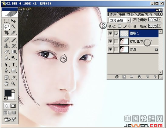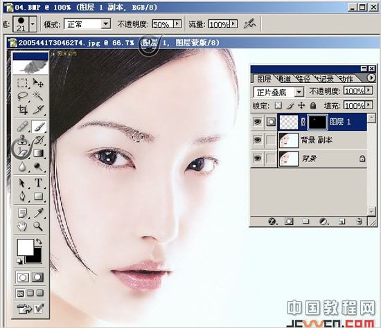 2,在选中眉毛羽化后,按下[ctrl+j]得到眉毛独立的图层[图层1],在图层调板中,将眉毛的[混合模式]从[正常]切换成[正片叠底],这会使图层片变暗。
