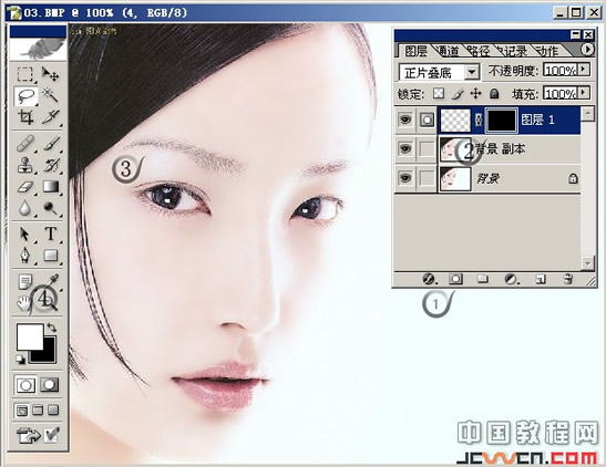 3,按下Alt键,并单击图层调板底部的图层蒙板图标(按下Alt键将使用黑色填充,这将隐藏正片叠底的效果,可以看到眉毛看起来恢复正常了,然后,按下字母D将前景色设为白色。
