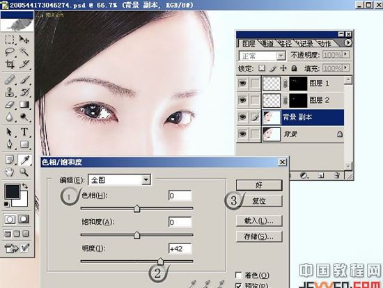 9,在[色相/饱和度]对话框中,将[编辑]菜单切换成[全图]将[明度]滑块向右拖动以增加白眼球的亮度。点击[好],然后按下ctrl+D取消选区,修改完成。