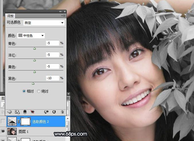 4、再次创建可选颜色调整图层,分别选择中性色及黑色,参数如图,效果如图。