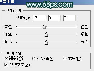 4、创建色彩平衡调整图层,对阴影,高光进行调整,参数设置如图8,9,确定后把蒙版填充黑色,用白色画笔把人物部分擦出来,效果如图10。这一步微调人物部分的颜色。