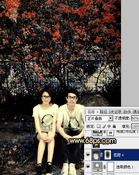 9、新建一个图层,按Ctrl + Alt + Shift + E 盖印图层。按Ctrl + Shift + U 去色,混合模式改为“正片叠底”,不透明度改为:50%,加上图层蒙版,用黑色画笔把中间部分擦出来,效果如下图。