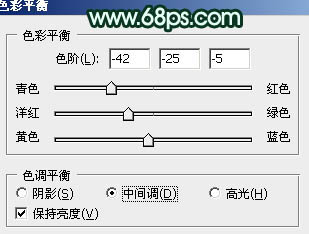 4、再创建色彩平衡调整图层,对中间调进行调整,参数设置如图7,确定后把蒙版填充黑色,用哪个白色画笔把左上部背景部分擦出来,效果如图8。这一步调整背景局部颜色。