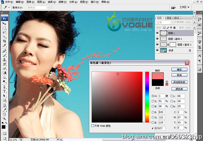 19、新建图层,点击前景色,用拾色器吸取红色花瓣的颜色,如图所示。