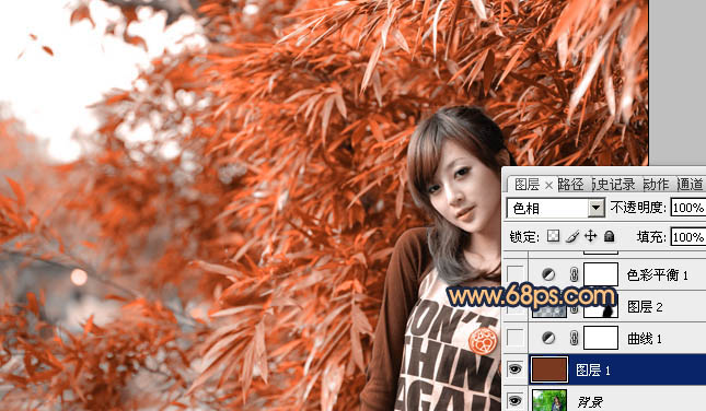 1、打开原图素材,新建一个图层填充红褐色:#793921,混合模式改为“色相”,效果如下图。这一步快速把图片转为单一的红色。