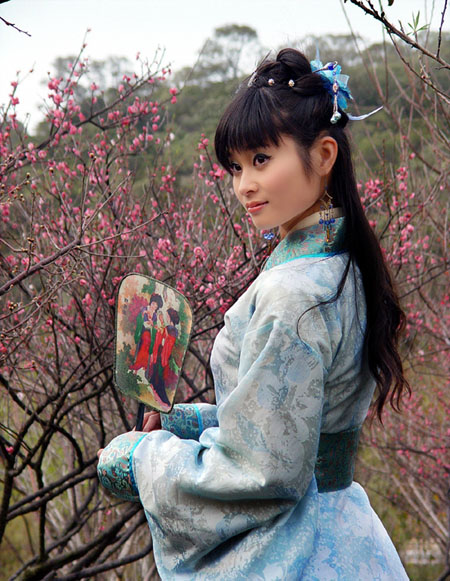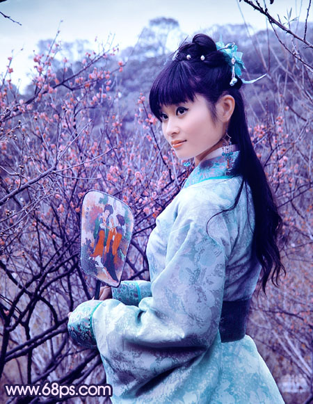 古装图片调色是比较麻烦的,需要根据人物服饰选择较为古典的主色。如素材图片,人物服饰为蓝色,可以考虑主色用深蓝色。主色选好后调整好人物与背景的融合度即可。
