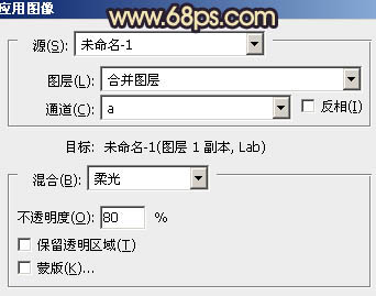 11、新建一个图层,盖印图层。选择菜单:图像 > 模式 > Lab颜色,选择不合拼。然后把当前图层复制一层,执行:图像 > 应用图像,参数设置如图24。确定后选择菜单:图像 > 模式 > RGB颜色。