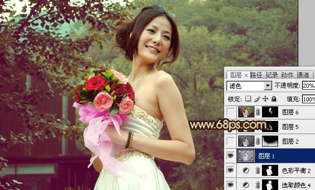 7、按Ctrl + Alt + ~ 调出高光选区,按Ctrl + Shift + I 反选,新建一个图层填充紫褐色:#391234,混合模式改为“滤色”,不透明度改为:20%,效果如下图。这一步微调暗部的颜色。