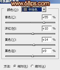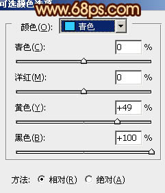 3、创建可选颜色调整图层,对黄、绿、青、白、中性色进行调整,参数设置如图6 - 10,效果如图11。这一步加强背景的青色及沙滩的金黄色。