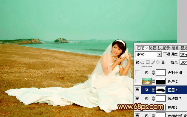 Photoshop调出沙滩美女婚片柔美的青黄色(4)