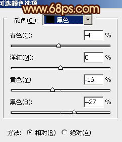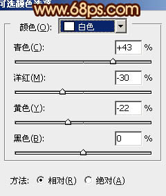 8、创建可选颜色调整图层,对白色及黑色进行调整,参数设置如图18,19,效果如图20。这一步微调高光及暗调部分的颜色。