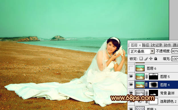 Photoshop调出沙滩美女婚片柔美的青黄色(6)