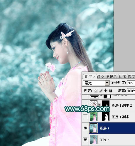 5、新建一个图层,盖印图层。混合模式改为“柔光”,不透明度改为:30%,效果如下图。