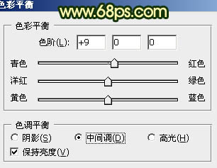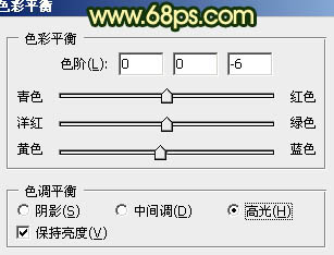2、创建色彩平衡调整图层,对中间调及高光调整,参数设置如图6,7,效果如图8。这一步增加图片的黄色及青色。