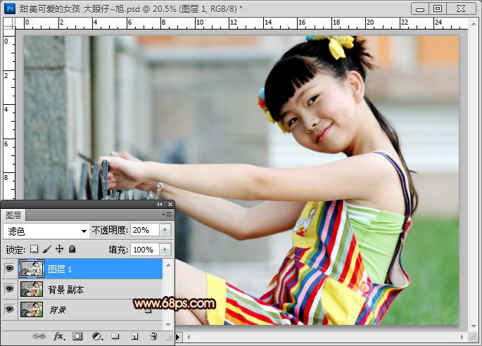 1、打开照片后,复制一层,得到图层副本,转换到通道面板,选择绿色通道,CTRL+A全选,CTRL+C复制,转换到图层面板,新建空白图层按CTRL+V粘贴,设置图层的混合模式为滤色,图层不透明度为20%,这一部是提亮照片的亮度,效果如图。