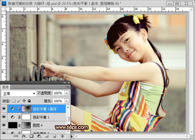9、按CTRL+J复制一层色彩平衡,并在图层蒙板上拉出径向渐变效果,如图。