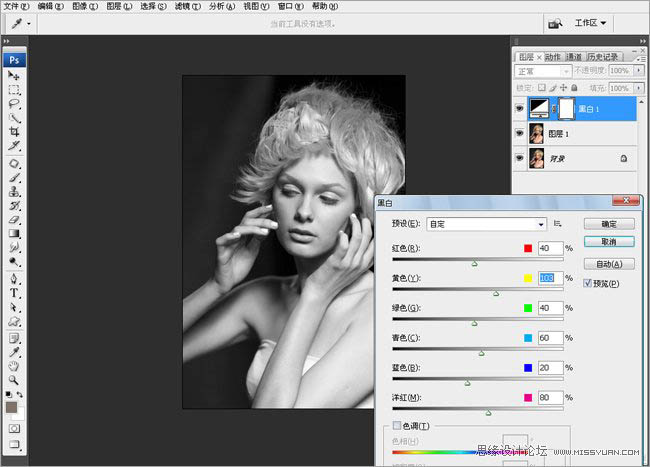 3、新建一个黑白调整层,具体可以调节参数。在这里调节了黄色通道的明度,因为原图是黄色眼影,但是感觉做成黑白以后,黄色眼影比较突出,所以现在把黄色眼影去掉,让眼影和肤色融为一体。
