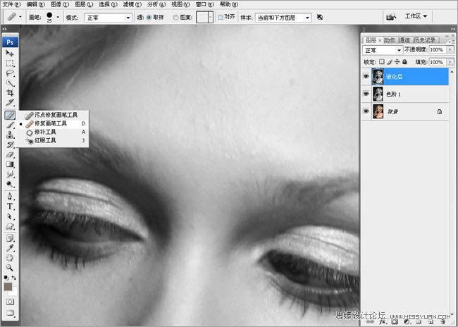 6、整体液化好以后,对人物的瑕疵进行细致修饰,这里仔细的用 修复画笔工具。