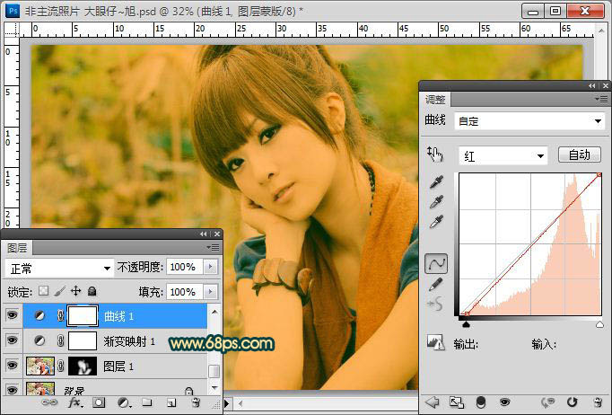 3、创建曲线调整,分别调整,红/绿/蓝通道,参数如图,效果如图。