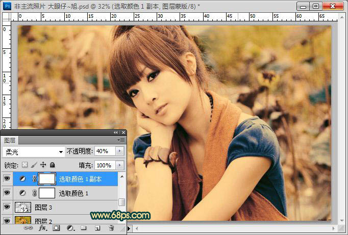 6、按CTRL+J复制一层可选颜色调整图层,并设置图层的混合模式为柔光,图层的不透明度为40%,加强下色彩强度,效果如图。