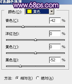 5、创建可选颜色调整图层,对黄,绿进行调整,参数设置如图11,12,效果如图13。这一步加微调图片的暖色。
