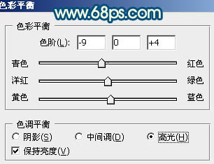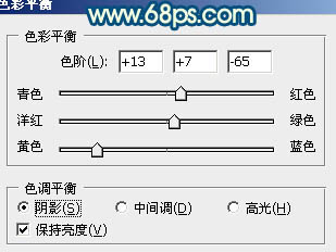 4、创建色彩平衡调整图层,对阴影、中间调、高光进行调整,参数设置如图12 - 14,确定后把图层不透明度改为:30%,效果如图15。人物肤色部分可能有点失真,后面会修复。
