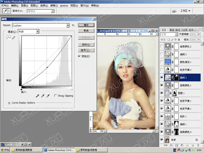 8、选中人物头上的包纱用“曲线”压暗使其不会太轻浮。