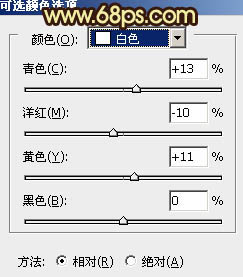1、打开原图素材,创建可选颜色调整图层,对黄、绿、白进行调整,参数设置如图1 - 3,效果如图4。这一步把背景的绿色转为淡黄色。