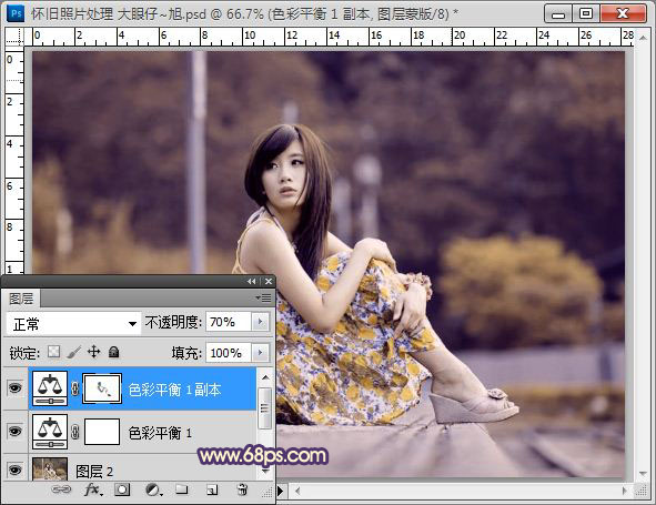 4、按CTRL+J复制一层色彩平衡调整图层,并用画笔擦去人物部分,加强下效果。