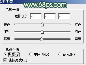 5、创建色彩平衡调整图层,对阴影、中间调、高光进行调整,参数设置如图8 - 10,效果如图11。这一步是微调暗调及高光部分的颜色。