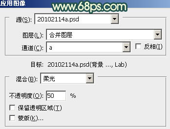 12、人物部分还不够红润,需要再美化一下。新建一个图层,按Ctrl + Alt + Shift + E 盖印图层。选择菜单:图像 > 模式 > Lab颜色,选择不合拼。然后执行:图像 > 应用图像,参数设置如图21,效果如图22。