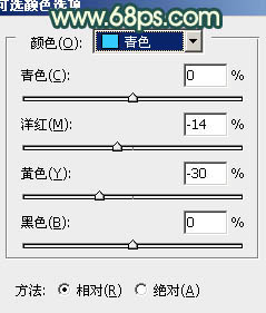 14、创建可选颜色调整图层,对青,白进行调整,参数设置如图26,27,效果如图28。