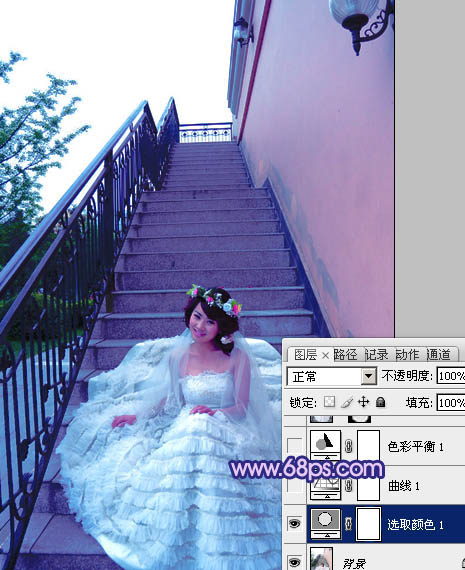 Photoshop调出楼梯婚片艳丽的蓝紫色(2)