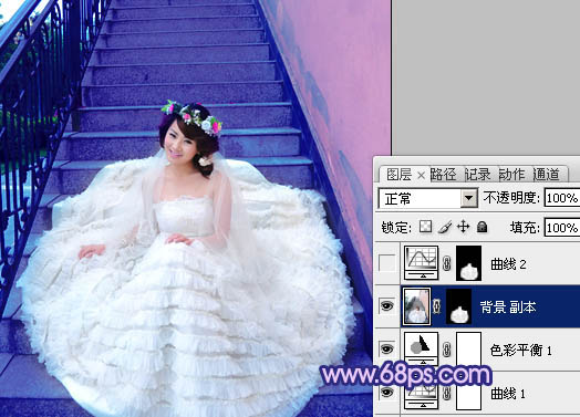 Photoshop调出楼梯婚片艳丽的蓝紫色(5)